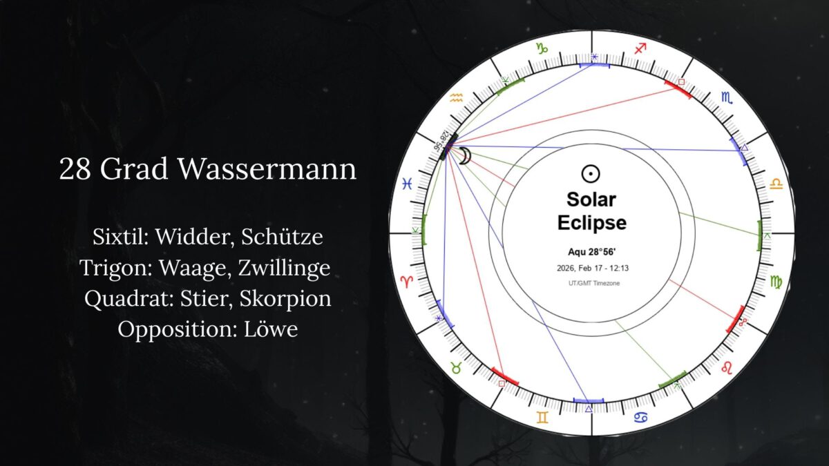 Diese Sonnenfinsternis steht auf 28°56′ Wassermann – und bildet bestimmte Aspekte zu anderen Zeichen.